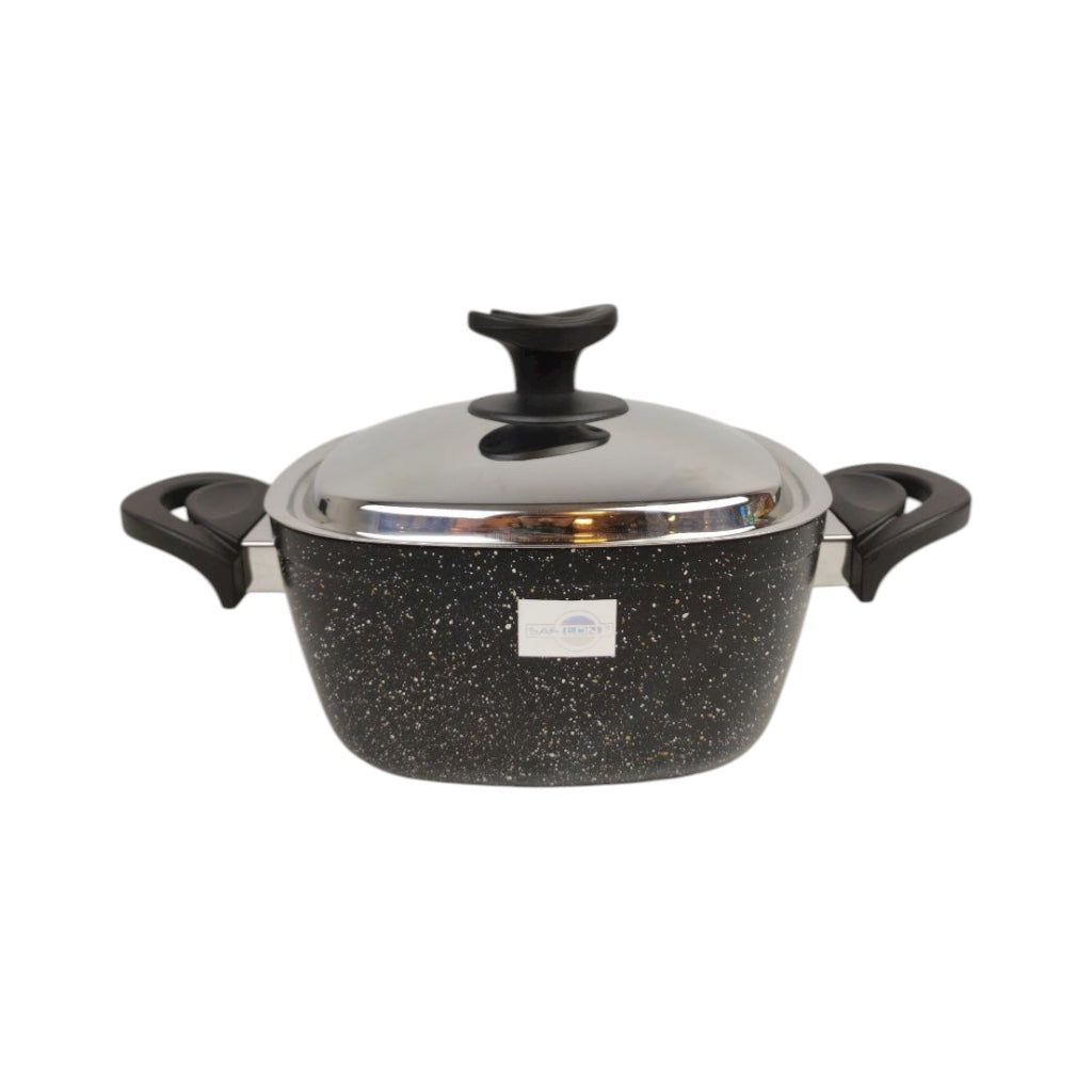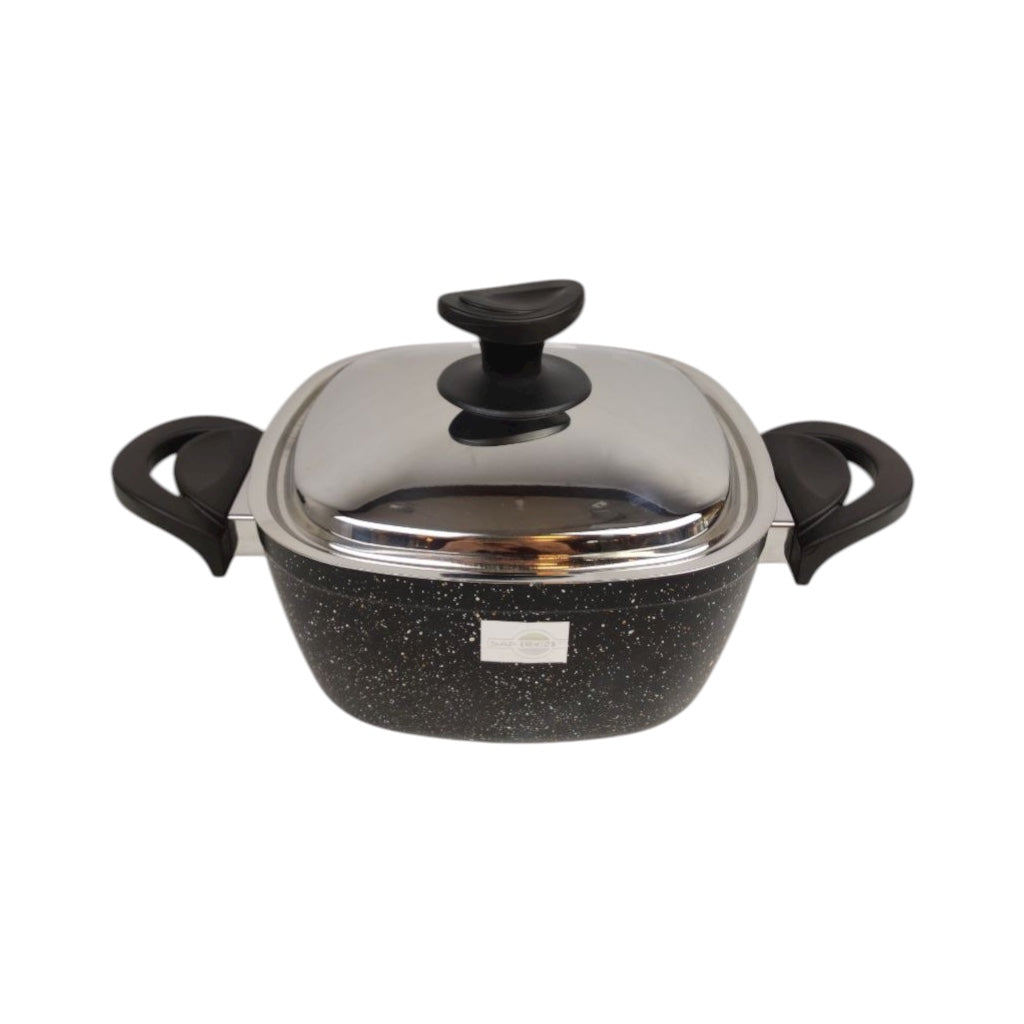حلة الجرانيت من سافلون هي الحل الأمثل لطهي صحي وفعال، ومتوفرة بالمقاس الذي تختاره. صُنعت هذه الحلة من خامة متينة وعالية الجودة مع طلاء جرانيت فاخر، معروف بأدائه المتفوق في منع الالتصاق ومتانته الممتازة. يضمن هيكل الحلة توزيعًا متساويًا للحرارة، مما يمنع تكون البؤر الساخنة ويتيح طهي طعامك بشكل مثالي في كل مرة. اللمسة النهائية باللون الأسود الأنيق المنقط وتصميمها العصري، مع غطاء ستانلس ستيل لامع، يضيفان لمسة جمالية رائعة لمطبخك ومائدة الطعام. المسكات المريحة والمعزولة للحرارة توفر قبضة آمنة ومريحة، حتى عند امتلاء القدر.