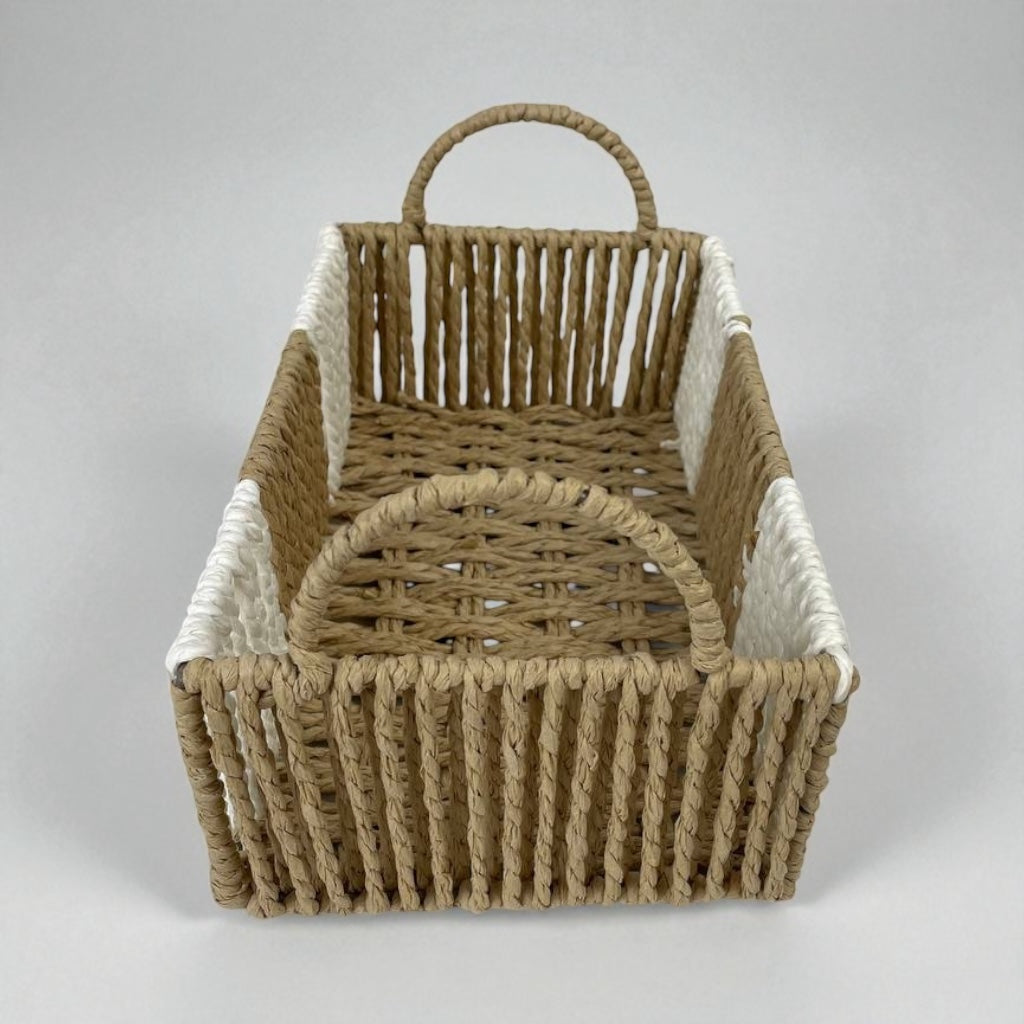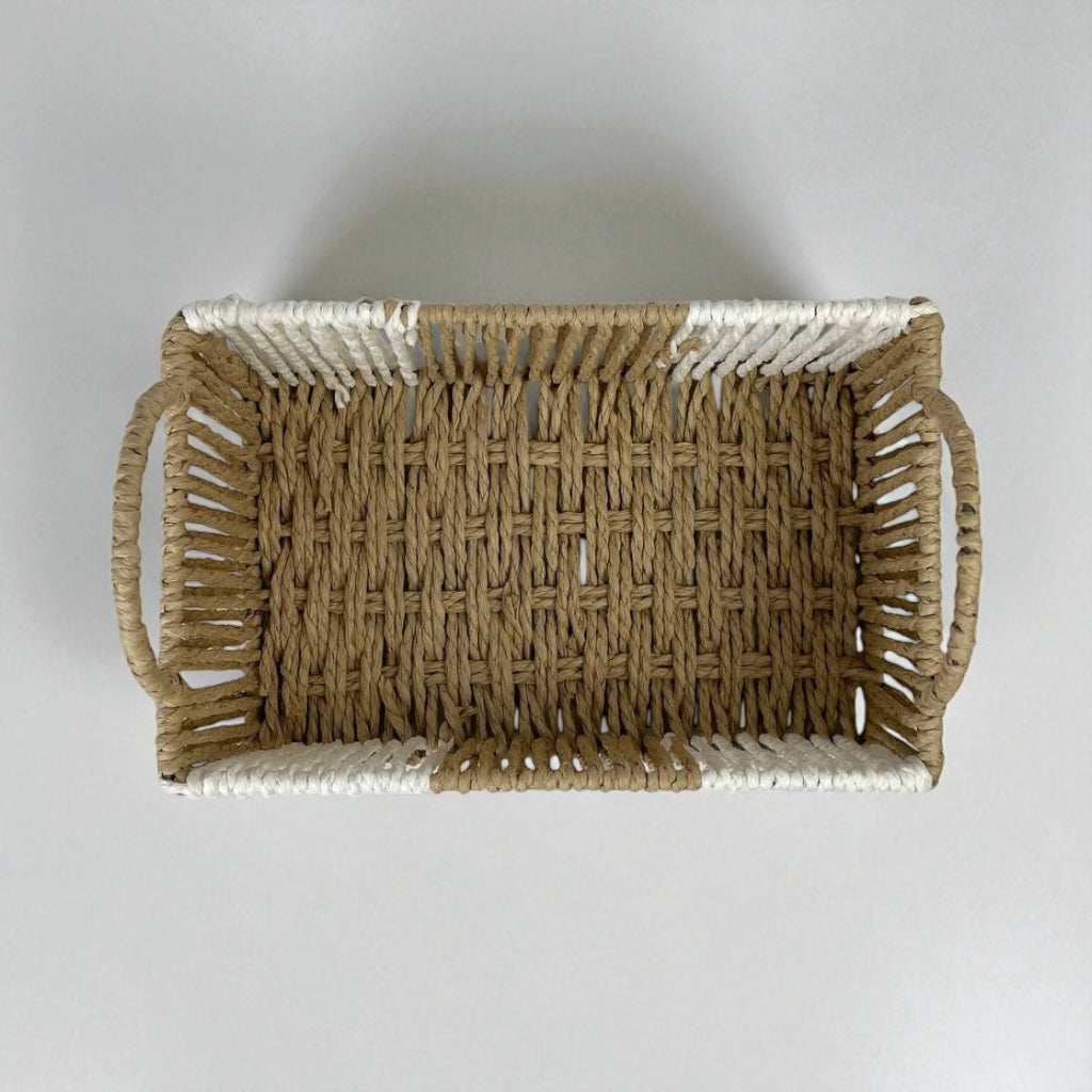 Bring natural charm and practical organization into your home with this handwoven rectangular wicker basket, designed in a beautiful natural brown tone with white decorative accents. Measuring 24 x 16 x 9 cm, it is perfect for organizing small household items while enhancing your décor with a touch of rustic elegance. Equipped with sturdy handles on both ends, this basket is as functional as it is stylish.
