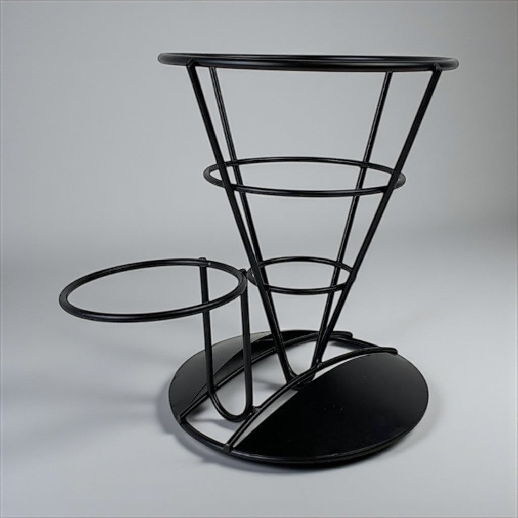 Serve your appetizers in style with this Black Metal Fry Stand with Sauce Holder, designed to add a professional touch to your home dining or restaurant presentation. This contemporary serving rack is perfect for holding crispy french fries, vegetables, fruit slices, and a variety of other appetizers, complete with a convenient holder for your favorite dipping sauces.