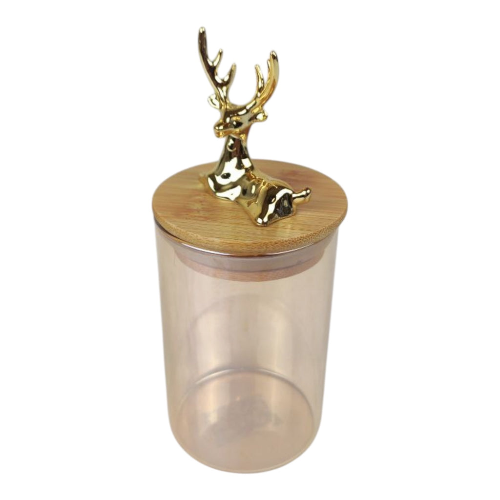 Bring charm and elegance to your home with the Glass Storage Jar with Wooden Lid and Golden Deer Design. With its taller size, this jar is not only functional but also doubles as a decorative piece that enhances your kitchen, living room, or dining space.