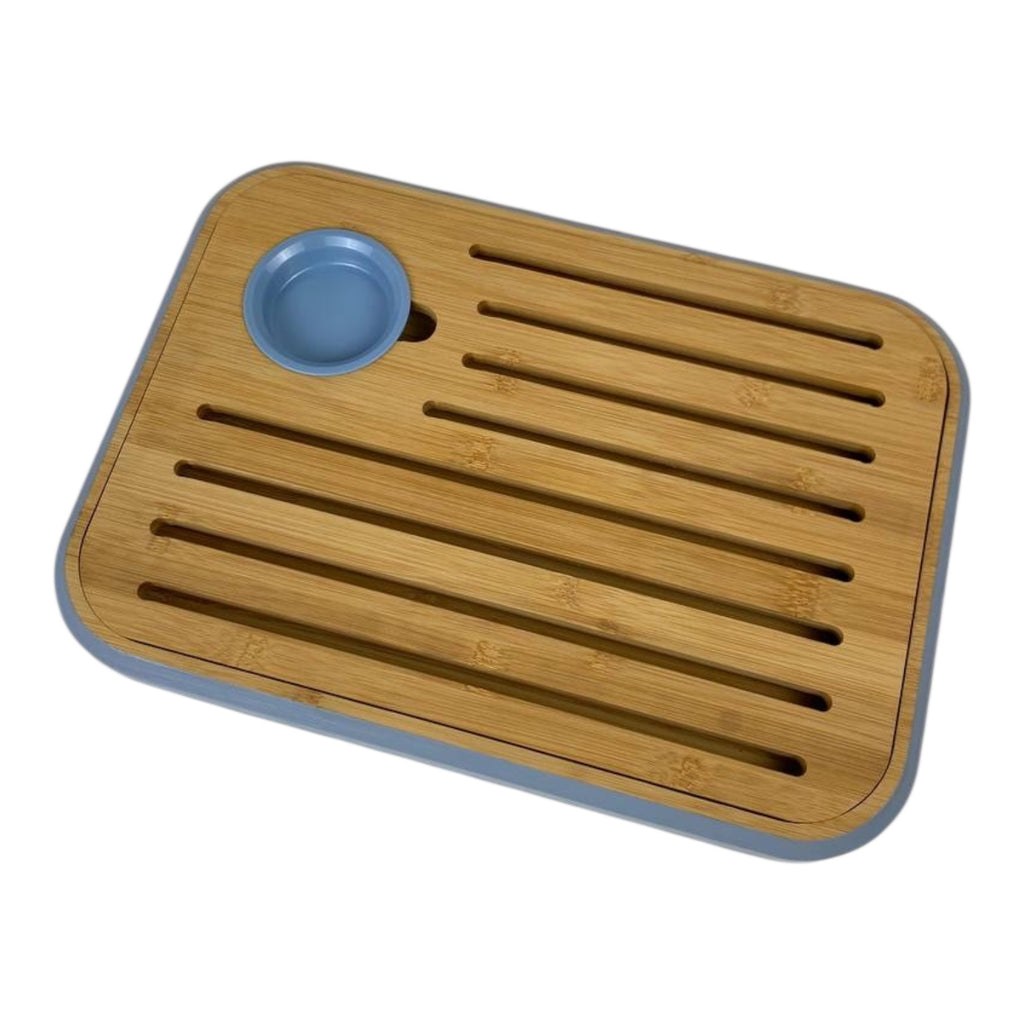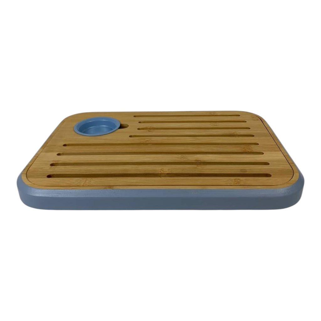 Dual Function Design: Wooden slotted board for slicing bread and serving cheese, with a plastic tray underneath.
