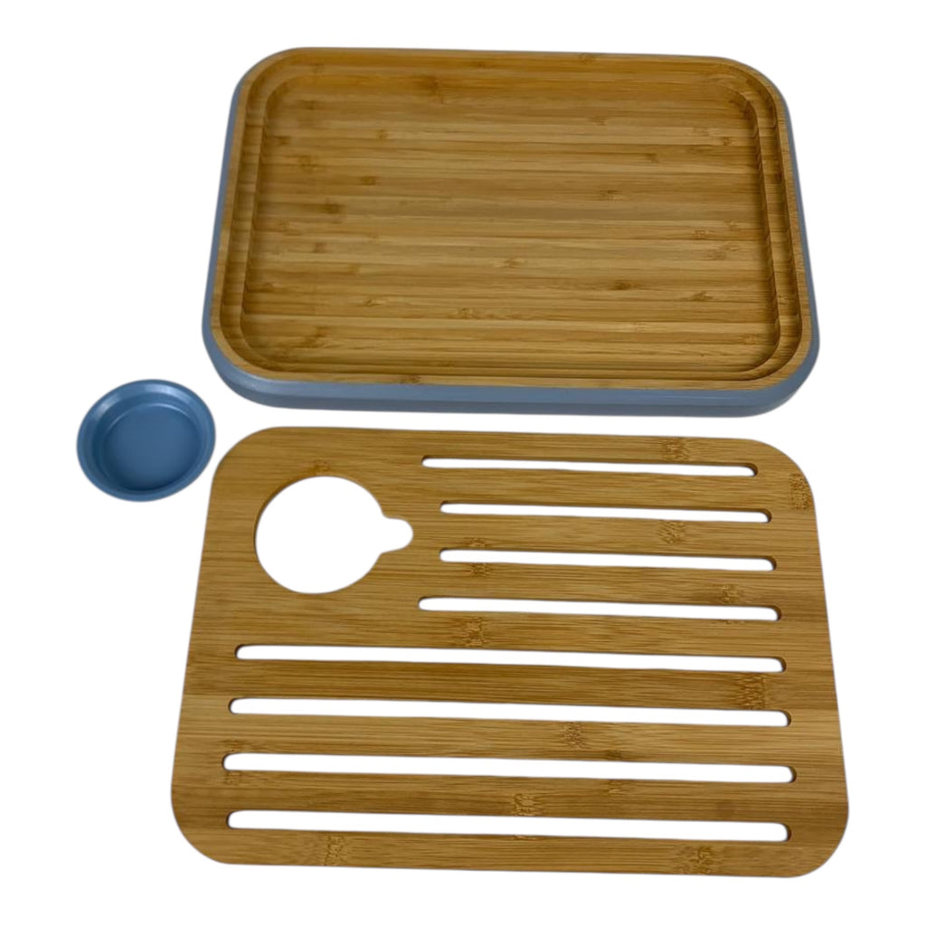 Care Instructions: Wipe the wooden board with a damp cloth; wash the plastic tray with warm soapy water and dry thoroughly.
